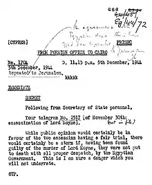 Brand was arrested and taken to Cairo, where he was questioned for several months. Brand reported that during one of the interrogations an Englishman (sic) he did not know had asked him about Eichmann's proposal, then replied "What can I do with a million Jews? Where can I put them?". On leaving the room, Brand reported, his military escort had told him that the man who had made that remark was Lord Moyne.[54] Brand then added: "I later learnt that Lord Moyne had often deplored the tragic fate of the Jews. The policy which he had to follow, however, was one dictated by a cold and impersonal administration in London. It may be that he paid with his life for the guilt of others."[53]