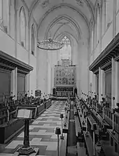 In addition to church building, Tapper was also engaged in ecclesiastical decorative fittings and ornaments. The ornate entrance to the choir at Ludlow Parish Church is his work, as is the gilded altarpiece in St Chad's, Stafford[19] and the organ casing and font cover in St Wulfram's Church, Grantham, and he designed a silver processional cross for York Minster.[20] He also enjoyed a lucrative arrangement with the Gas Light and Coke Company, designing appliance showrooms in the Art Deco Streamline Moderne style.[4][21]