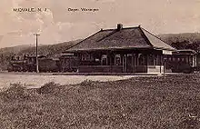 The Erie built a new passenger station at Midvale in 1901.[5] This new station depot was built at a design of 43 by 19 feet (13.1 m × 5.8 m) in design, with a freight house of 40 by 12 feet (12.2 m × 3.7 m).[10] William Mullen, a local contractor, did the carpentry, roofing, iron, masonry and painting of the new passenger station at the cost of $2,025 (1901 USD).[11]