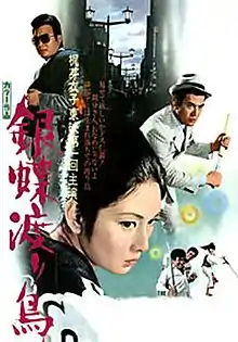 Wandering Ginza Butterfly (銀蝶渡り鳥, Gincho Wataridori) is a 1972 Japanese gangster film directed by Kazuhiko Yamaguchi, and co-written with Isao Matsumoto.[1] The movie stars Meiko Kaji and Tsunehiko Watase.[2] The movie was followed with a 1972 sequel entitled Gincho Nagaremono: Mesuneko Bakuchi.