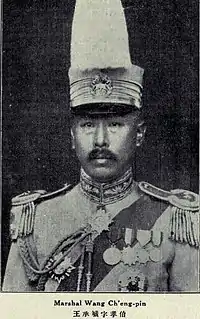 Wang Chengbin (Chinese: 王承斌) (August 21, 1874 – February 15, 1936) was an ethnic Manchu Chinese general of the Warlord Era of the Republic of China. He was the father of Hong Kong cartoonist Alfonso Wong. Born in Fengtian (now Liaoning) province, Wang attended the Baoding Military Academy from 1907–09, joining the New Army shortly afterward and being stationed in Changchun, Jilin province. In October 1911, after the outbreak of the Wuchang Uprising, he was sent to Shanxi Province to suppress supporters of the Xinhai Revolution. In August 1912 he was made commander of the 11th Regiment, which was part of the 3rd Division, 6th Brigade. In autumn 1913 he went with the 3rd Division to Yuezhou (now Yueyang in Hunan), to suppress the Second Revolution. In 1915, he went with the 3rd Division to Sichuan province to suppress opposition to the Empire of China. In July 1917 he acted with Wu Peifu to bring down Zhang Xun's Manchu Restoration.