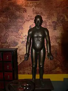 Acupuncture has been known since at least several centuries prior, and body models were being created earlier too (e.g. lacquer figurines excavated from a Han Dynasty tomb[2]), but the ones created by Wang Weiyi were much more precise and of human size. They are sometimes called Tiansheng Bronze Figures (天聖銅人; 天圣铜人) after the era name in which they were constructed.[lower-alpha 2] The two man-sized bronze figures were designed with care about the actual human body proportion. They were engraved with 354 acupoints - 4 millimeter deep, marked with names and connected according to the twelve meridians. The limbs were movable and disassemblable. Inside the bronze trunk, there were internal organs and skeleton made of wood. Replacing paper models with this three-dimensional apparatus was a great improvement in teaching and examination: the outside of the bronze statue was first covered with wax to seal the acupoints and water (or mercury) was poured inside the dummy. If the needle was inserted by the examinee into the correct acupoint, water or mercury would ooze out.[1]
