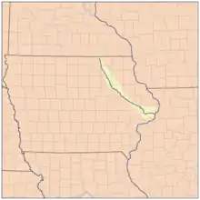 The Wapsipinicon River (/wɒpsɪˈpɪnɪkɒn, -kən/,[4] locally known as the Wapsi) is a tributary of the Mississippi River, approximately 300 miles (480 km) long,[5] starting near the southeastern border of Minnesota and running through northeastern Iowa in the United States. It drains a rural farming region of rolling hills and bluffs north of Waterloo and Cedar Rapids.