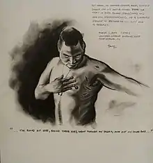 Significant themes in the chronicle of twentieth-century wars have been developed by non-military, non-official, civilian artists. For example, society portraitist Arabella Dorman's paintings of wounded Iraq War veterans inspired her to spend two weeks with three regiments in different frontline areas: the Green Jackets at Basra Palace, the Queen's Own Gurkhas at Shaibah Logistics Base ten miles south-west of Basra, and the Queen's Royal Lancers in the Maysaan desert. In the field, Dorman drew quick charcoal portraits of the men she met. Returning to England, the sketches she made helped her use art to "evoke the emotions and psychological impact of war," rather than depicting the "physical horror" of war.[35]