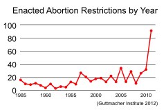 Democratic strategist Zerlina Maxwell wrote an editorial for U.S. News & World Report in which she cited a Guttmacher Institute analysis showing state legislatures enacted 135 pieces of legislation affecting women's reproductive rights as evidence that the "Republican 'War on Women' is no fiction."[10] The analysis found that between 2000 and 2011, the number of states hostile to abortion rights have increased markedly, and that in 2011 there was an unprecedented rise in the number of provisions passed by state legislatures restricting abortion.[50]