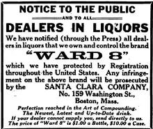 In 1898 Democratic political czar Martin M. Lomasney hoped to capture a seat in the state's legislature, the General Court of Massachusetts. Lomasney held considerable power in the city for nearly 50 years. The story goes that the drink was created to honor his election, and the city's Ward 8 which historically delivered him a winning margin.[2] In 1915 the Santa Clara Company registered "Ward 8" as a trademark with the United States Patent Office claiming use since November 1912 [3] and published a notice that they would prosecute any infringement.[4] During prohibition the Daily Boston Globe reported that the drink was believed to have originated at the "old" and abandoned Quincy House.[5] Competing, but unfounded myths abound in print and on the Internet. One story reports that it originated in New York in an area known for political corruption, another that the cocktail is a traditional drink of the Scots Guards.