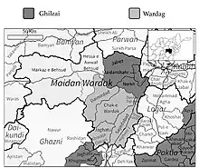 The Wardak (Pashto: وردګ) or Wardag are Karlani Pashtons live in central and eastern Afghanistan, mainly in Wardak Province.[2] They migrated to the Wardak province in around 1730.[3] The Wardak people are divided into Mirkhel, Mayar, and Nuri sub-clans. The Wardak live in all of the province's districts, and form the majority of people in the Saydabad, Chak Wardak, Jaghatu, and Day Mirdad (Jilga) districts of central and southern Wardak. They speak the Pashto language and many also speak Dari-Persian. Both are the official languages of Afghanistan. Wardak are the cousins of Mangal , Orakzai and Dilazak . [4]