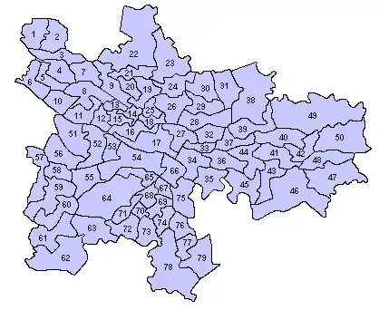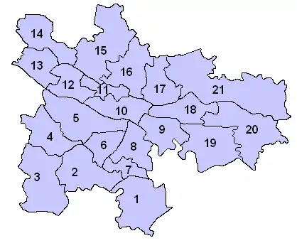 The City of Glasgow is divided into a number of wards.[3] These electoral districts, as they are also known, are used to elect councillors to Glasgow City Council. The council, composed of the elected members from each ward, provides local government services to the City of Glasgow.
