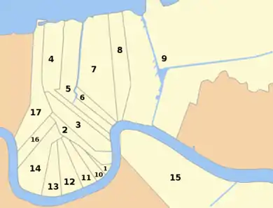 Most of the boundaries of Wards 1 through 11 were drawn in 1852 when the city was reorganized from three separate municipalities into one centralized government.[2] With various changes, these boundaries remain largely the same, and have not changed at all since the 1880s.[1] The rest of the Wards were formed from the expansion of the city boundaries in the 1870s. The 12th, 13th, and 14th Wards were formed by annexation of land up river from the older city of New Orleans that had been Jefferson City and Greenville; the 15th by the annexation of the city of Algiers, Louisiana across the Mississippi River from the rest of the city, and finally the 16th and 17th Wards formed from the annexed city of Carrollton.[1]