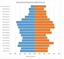 The median age of Ware Shoals's residents was 42.2 years old in 2010; 39.7 years for men and 44.6 for women. Ware Shoals, like much of America, has a constrictive population pyramid, the result of declining birth rates and increasing life expectancy.