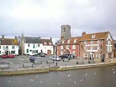 Archaeological evidence exists of a small Roman settlement, though the current town was founded by the Saxons.[2] The Roman name is unknown, but the town is referred to as Werham in the Anglo-Saxon Chronicle entry of 784, from Old English wer (meaning 'fish trap, a weir') and hām ('homestead') or hamm ('enclosure hemmed in by water').[3]