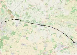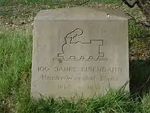 The "Rheda Railway" (Rhedaer Bahn) refers to the line from Rheda via Wiedenbrück, Langenberg, Bad Waldliesborn to Lippstadt. The last passenger train ran on the line on 30 November 1979. The transport of freight between Langenberg and Lippstadt was abandoned on 16 June 1983 and the track was dismantled in 1985. Freight traffic ended between Wiedenbrück Süd and Langenberg on 1 December 1994 and the section was closed on 30 November 1995. Freight traffic was abandoned on the remaining part of the line on 31 December 2000 and the line was closed on 1 May 2001.[4] Since 2006, the Westfälische Localbahn (Westphalian Local Railway) has tried to reactivate the line as a museum railway, although the line is not currently licensed for rail operations by the Federal Railway Authority. The city of Rheda-Wiedenbrück has been building a cycle path on the old route since 2009. Parts of the line have now been dismantled.