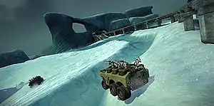 Three expansion packs have been released. The first, "Operation: Omega Dawn," released on December 20, 2007, includes a new night-themed map, Omega Factory, and a new aircraft, the KT-424 Combat Dropship.[38] The second expansion pack was released on April 17, 2008 entitled "Operation: Broken Mirror",[39] which includes a new armoured personnel carrier equipped with an energy shield and the ability to boost, similar to a Warhawk, as well as serving as a mobile spawn point.[31] A new map called Vaporfield Glacier was also included in the new expansion. It is the largest map to date, and includes 10 different layouts.[40] In the PlayStation Store, there is also an option to purchase the first two Booster-packs for a reduced price,[41] and there will be another combo pack with all three included. The latest booster pack, "Operation Fallen Star," was released on August 28, 2008 and added the Icarus MK1 Jetpack which allows troops to fire while airborne as well as a new map called Tau Crater.[42] All three of the booster packs cannot be combined, nor can one affiliate with another, and people who do not own an expansion featured in a server they are attempting to join will not be able to join the server.