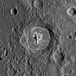 Closeup of Warhol at high sun angle showing the abundant hollows on the crater floor (MESSENGER NAC)