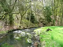 The Warnau rises in the area of Behningen near Neuenkirchen, flows generally southwards from the village of Ottingen, passes Ahrsen, Jarlingen, Benefeld and Cordingen and discharges into the Böhme south of Borg in the municipality of Walsrode. Near Ottingen the Warnau is also called the Schneebach, which comes from the fact that the stream once formed the border (Low German: Sneede) between the Bishopric of Verden and the Duchy of Lüneburg, now the district boundary between Heidekreis and Rotenburg. Between Cordingen and Benefeld it forms a charming, narrow, wooded valley with a restored mill, the Cordinger Mühle, that hosts events. Downstream to its mouth the meadow valley is accompanied on one side by a picturesque bluff with narrow footpath. At its southern end the path meets the Bomlitz Archaeological Trail (Archäologischen Wanderpfad Bomlitz), which runs through a Bronze Age burial site on a rounded hilltop in the recreation area of Eibia-Lohheide and continues south to the street Vogelparkstraße to the impressive system of ramparts belonging to the Old Saxon fort of Hünenburg at the confluence of the Warnau and the Böhme. The site is linked by legend to the founding of the oldest Lüneburg Heath's monasteries, the nearby Walsrode Abbey.