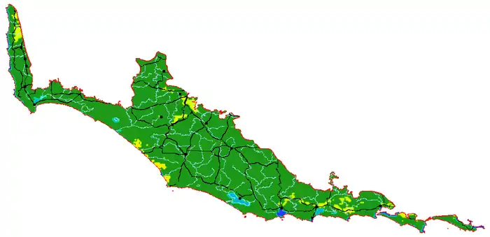 The Warren region falls entirely within what the Department of Agriculture and Food calls the "Intensive Land-use Zone" (ILZ), the area of Western Australia that has been largely cleared and developed for intensive agriculture such as cropping and livestock production. Despite this, only a small amount of the region's natural vegetation has been cleared and given over to agriculture. The proportion of cleared land was calculated as 13.2% in 2002,[11] although Beard gave a much larger figure of 31% in 1984.[5] The remaining land is considered to be native vegetation, but this need not be pristine; a substantial proportion of the remaining native vegetation has been degraded by selective logging and other human activities.
