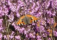 Warren Hill provides an important heathland habitat covered by the United Kingdom Biodiversity Action Plan. The hill immediately overlooks Withybed Wood, itself an important ecosystem and migratory point.[10] Hengistbury Head was declared a Local Nature Reserve in 1990; the heathland in particular is designated as both a Special Area of Conservation and a Special Protection Area, part of a network of the best wildlife sites in Europe.[12] The plateau is dominated by ling (common heather), with heather-bell found in the drier soils and cross-leaved heath in wetter areas. Dwarf gorse and tormentil give the area a touch of extra colour.[13] Sundews, carnivorous plants that supplement their diet by trapping and devouring insects, can be observed in the boggy areas.[13]