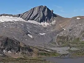 Warrior Mountain is located on the border of Alberta and British Columbia on the Continental Divide. It was named in 1917 after HMS Warrior.[1][2] The first ascent of the mountain was made in 1930 by Kate (Katie) Gardiner and Walter Feuz. The duo also made the first ascents of nearby Mount Sarrail and Mount Lyautey that same year.[3]