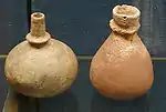 In the later Wartberg, strap-handled cups, funnel beakers, varied bowls, large pots with holes below the rim and collared bottles occur. The frequent presence of collared bottles, not least in the tombs, is of special interest. The bottles are made with somewhat more care than other vessels; their very specific shape suggests a special function, often suggested to be connected with the storage of special material, like vegetable oil or sulphur, perhaps for healing purposes.[23]