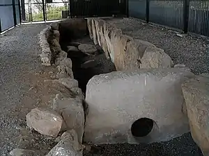 These include the tombs at Züschen near Fritzlar, at Lohra, at Naumburg-Altendorf, at Hadamar-Niederzeuzheim (now rebuilt in a park at Hachenburg), at Beselich-Niedertiefenbach, at Warburg, Rimbeck and at Grossenrode, as well as two tombs near the Calden enclosure.[13] A tomb at Muschenheim near Münzenberg may also belong to the same type,[14] as may a further one at Bad Vilbel near Frankfurt am Main which was destroyed after 1945.[15] The best known of these tombs are those of Züschen, Lohra, Niederzeuzzheim and Altendorf. They normally contained the inhumed remains of multiple individuals (the Altendorf tomb contained at least 250 people) of all ages and both sexes. Lohra is an exception insofar as there the dead were cremated. Gravegoods are scarce but include pottery (collared bottles), stone tools and animal bones, especially the jawbones of foxes, which may have played a totemic role. The Züschen tomb is also remarkable for the presence of rock art.[16] Some of the tombs can be directly associated with nearby hilltop sites or settlements,[17] that is, the Züschen tomb with the Hasenberg and the Calden tombs with the earthwork. According to the German archaeologist Waltraud Schrickel, the association with gallery graves suggests a west European influence, perhaps from the Paris Basin in France, where very similar tombs occur.[18] The Wartberg tombs appear to start developing around 3400 BC, earlier than most of the known settlements.[19]