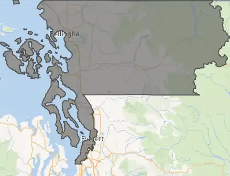 Washington's 2nd congressional district includes all of Island and San Juan counties, and neighboring areas on the mainland, from Bellingham in the north to Lynnwood in the south. Before re-districting in 2012, the district encompassed the northern portion of Western Washington, from the vicinity of the King/Snohomish county line to the Canada–US border, including the San Juan Islands and the exclave of Point Roberts. Since 2001, it has been represented by Democrat Rick Larsen.