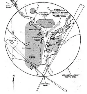 Crowded airspace in the Washington DC area resulted in the Federal Aviation Agency establishing special flight restrictions which were published in the 1961 Code of Federal Regulations as part of Title 14 – Aeronautics and Space.[13] Specific instructions for the Washington-Virginia Airport included the following: