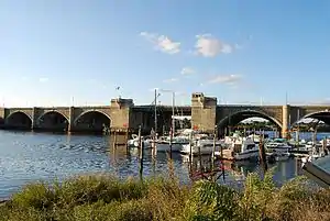 The Washington Bridge is a series of three bridges carrying Interstate 195, US Route 6, US Route 44, and U.S. Route 1A over the Seekonk River connecting India Point in Providence to Watchemoket Square in East Providence, Rhode Island. The historic portion of the bridge dating to 1930 serves as the pedestrian crossing, and bike link to the East Bay Bike Path. The pedestrian span is also a part of the Washington-Rochambeau National Historic Trail.
