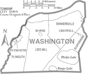 There are three incorporated towns in Washington County; Plymouth is the county seat, while other towns are Roper and Creswell. Washington County is known for rich farmland, extensive forests and abundant public access waters. The Roanoke River and Albemarle Sound form the northern boundary. Lake Phelps is 16,000 acres and is part of Pettigrew State Park in Creswell. Somerset Place is a restored antebellum plantation and NC Historic Site on Lake Phelps.