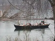 The lower park includes 13 historic buildings including McConkey's Ferry Inn,[1] where General George Washington and his aides ate dinner and made plans prior to the crossing. Among the historic buildings is a 20th-century barn that houses 5 replica Durham Boats. Durham boats were large, open boats that were used to transport pig iron along the Delaware River at the time of the Revolution and these boats, along with the ferries and others, were used to transport soldiers, horses, and equipment across the river on the night of December 25–26, 1776. The replica boats are used each year when the nighttime crossing is reenacted in the park.