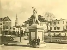 A statue of William Pitt the Elder was once located in Washington Park. The statue was moved to Washington Park from the Charleston Orphan House on Calhoun Street in 1881 and placed on a new pedestal of Fairfield County granite.[11] The statue suffered repeated damage, including a decapitation from a falling tree branch in November 1938, before being moved to the County Courthouse.[12] A statue of George Washington was later installed on the base of the Pitt statue following some local controversy. Plans for the new work began in 1992. The Washington statue was going to be a twice-life-size sculpture by Felix de Weldon.[13] Eventually, Jon Michel was chosen instead. The work, which cost $165,000, was unveiled on December 14, 1999.[14]