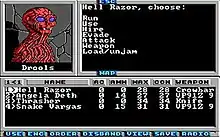 The player's party begins with four members and can grow to as many as seven by recruiting citizens and wasteland creatures. Unlike other computer role-playing games of the time, these non-player characters might at times refuse to follow the player's commands, such as when the player orders the character to give up an item or perform an action.[7] The game is noted for its high and unforgiving difficulty level.[8] The prose appearing in the game's combat screens, such as phrases saying an enemy is "reduced to a thin red paste" and "explodes like a blood sausage", prompted an unofficial PG-13 sticker on the game packaging in the U.S.[7]