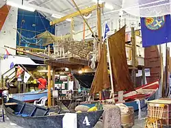 The exhibits include several types of boats found locally and associated artefacts, photographs and charts, plus nets and other items associated with their use. There are displays of maps, knotwork and boards showing the various uses of withy. There is also an example of a mudhorse which is a wooden sledge is propelled across the mudflats to collect fish from nets.[1]