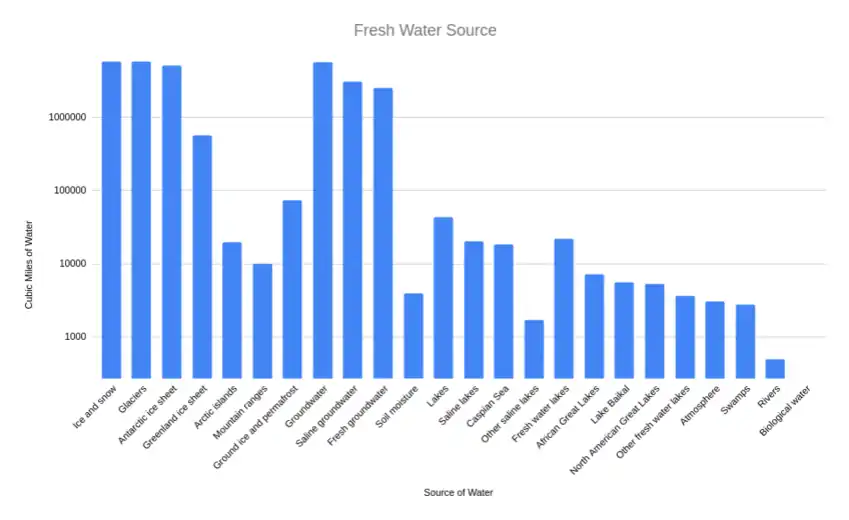 | Source of water | Volume of water in km³ (cu mi) | % total water | % salt water | % fresh water | % liquid surface fresh water |