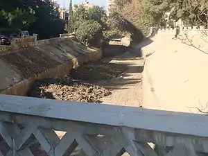 In 1999 the first wastewater treatment plant of Damascus was completed in Adra to the North-East of the city, treating a significant part of the sewage collected in the city. With a capacity of 485,000 m³/day it is a large plant capable of treating the wastewater of more than 2 million people.[8] The treated wastewater is discharged into irrigation canals in the Ghouta, where it irrigates 19,000 hectares of fruit trees.[1] The plant was financed by the Arab Fund for Economic and Social Development.[12] The government plans to build a total of 30 wastewater treatment plants throughout Greater Damascus, including in towns in the Barada gorge.[8] The European Investment Bank is financing the construction of four wastewater treatment plants to serve more than 400,000 inhabitants in the Southwest of Damascus. The bids for the design, construction and maintenance of the plants were published in 2008.[13] The Syrian-Qatari investment company plans to build a wastewater treatment plant in Jaramana Southeast of Damascus. Germany is also financing a wastewater treatment plant and associated sewers in the Yarmouk area South of Damascus.