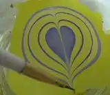 After the base coat has dried, tape is put around the fingers to gather the excess nail polish after the marbling. One or two drops of colored lacquer are chosen for the design and are added to a cup of clean water. The drops will create a circle on the water surface. The next color is added on top of the circle created by the previous drop. The resulting pattern is ready for application to the nail, but it can still be modified with a stick or toothpick to create different shapes. The nail is dipped into the pattern on the water and kept under water as a Q-tip is used to "grab" the remaining polish.[6]