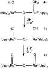 A number of ruthenium-aqua complexes catalyze the oxidation of water. Most catalysts feature bipyridine and terpyridine ligands.[3][4][2] Catalysts containing pyridine-2-carboxylate exhibit rates (300 s−1) comparable to that of photosystem II.[5][6] Work in this area has ushered in many new polypyridyl ligands.[7][8]