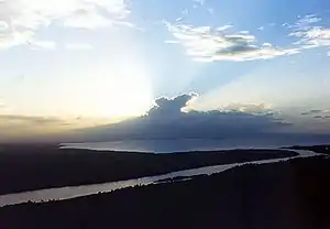 With an average width of 120 km, Costa Rica receives about 170 km3 from rain and about 75 km3 finds its way into the rivers and lakes of Costa Rica and yet another 37 km3 ends up in underground aquifers. The remaining water is lost through evaporation and evapotranspiration.[3] Costa Rica is divided into three major slopes or basins. The Atlantic side is the wet and rainy side and rarely experiences a deficit of water throughout the year. The Atlantic sloping side incorporates the Northern slope that drains into the San Juan River bordering Nicaragua and also towards the Caribbean Sea. The sub-basins within this slope contribute 5.8 km3 annually to Lake Nicaragua and more than half of the water that flows into the San Juan River or around 23.2 km3 The Pacific slope is more dry with a shared decline in average flow during the dry season. In total, there are 34 principal drainage basins in Costa Rica with 17 having a major sloping contour and range in size from 207 km2 to 5,084 km2.[2]