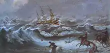 On 26 August, a strong northerly gale sprang up, accompanied by heavy rain. The top-gallant masts snapped and landed on the deck. On 27 August, the surgeon became extremely concerned, especially when the two anchors gave way at about 11pm. He and the Second Mate lit flares to signal their desperate situation. Early on the morning of the 28th, the wind grew to hurricane strength, and the troopship Abercrombie Robinson was driven ashore. Fearing punishment, the First Mate refused to order the cutting away of the fallen masts. Dr Kelsall ordered the freeing of the prisoners from their irons. From this point on the situation rapidly deteriorated.[16]