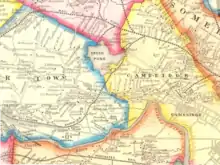 The western portion of the branch continued past the Town Hall area, then headed southwest toward Main and Pleasant Streets (near Bacon and Howard Streets) and across Bridge Street in the Bemis Neighborhood of Watertown. Although much of the area has been built over, from there the line ran adjacent to Pleasant Street through what are now mainly parking lot areas, through the Quincy Cold Storage property (now Repton Place) on Pleasant Street, through the former Raytheon property in Waltham, and across River Street near Willow Street, before crossing the Charles River near the Bleachery Dam.[23] The trestle for that crossing, approximately 140 years old, was dismantled and removed in August 2016. The line then crossed Calvary Street, then Newton Street, and proceeded across Pine Street before heading northwest, where it re-crossed the Charles, parallel to Elm Street. It then reached the Central Square area, and looped back into the Fitchburg Railroad main line.[24][25]