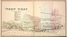 The location of the future city was taken by the village of Gibbonsville (1824) and its successor West Troy, and the hamlet of Washington (later Port Schuyler).[8] The farm owned by John Bleeker, stretching north from Buffalo Street (Broadway and 15th Street) to the farm owned by the Oothout family near 25th Street was purchased by Philip Schuyler, Isais Warren, Richard P. Hart, Nathan Warren, and others in 1823; they named it West Troy. Gibbonsville was the farm of James Gibbons (which he purchased in 1805), which stretched from North Street (8th Street) to Buffalo Street (15th Street).[7] Washington was settled sometime before 1814 and was the area south of Gibbonsville and today the area of Watervliet south of the Arsenal; it became known as Port Schuyler in 1827.[8] Although Gibbonsville and West Troy sat side by side (West Troy lying on Gibbonsville's northern boundary), there was a rivalry between the two and each named and laid out their streets with no regard to the street names and grids of the other.[8] In 1824 Gibbonsville became incorporated as a village, and in 1836 this was repealed when West Troy became incorporated as a village including Gibbonsville and Port Schuyler;[8] and in 1847 the Watervliet post office changed its name to West Troy.[9] In 1830, Gibbonsville had 559 people, West Troy 510, and Port Schuyler 450.[9]