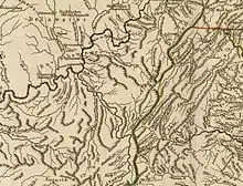 On July 13, 1709, Louis Michel, George Ritter, and Baron Christoph de Graffenried petitioned the King of England for a land grant in the Harpers Ferry and Shepherdstown area in what is now Jefferson County, in order to establish a Swiss colony. Neither the land grant nor the Swiss colony ever materialized. However, the early British fur trade outpost, Fort Conolloways (today Tonolloways) with the "Canallaway", "Cawnoyes" and "Conestogoes" tribes appeared near the mouth of the Conococheague on the Potomac River after 1695.[2] The Treaty of Albany (1720) designated the Blue Ridge Mountains as the western boundary of white settlement.[3] Orange County, Virginia, was formed in 1734. It included all areas west of the Blue Ridge Mountains, constituting all of present West Virginia. By 1739, Thomas Shepherd had constructed a flour mill powered by water from the Town Run or the Falling Springs Branch of the Potomac River. Shepherd, along with Isaac Garrison and John Welton, established the present town of Shepherdstown in today's Jefferson County. In October 1748 the Virginia General Assembly passed an act establishing a ferry across the Potomac River from the landing of Evan Watkin near the mouth of Conococheague Creek in present-day Berkeley County to the property of Edmund Wade in Maryland. Robert Harper obtained a permit to operate a ferry across the Shenandoah River at present-day Harpers Ferry, Jefferson County in March 1761.[3] Thus, these two ferry crossings became the earliest locations of government-authorized civilian commercial crafts on what would become West Virginia waterways.