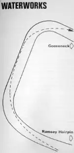 Following soon after Ramsey Hairpin, it is sequence of two right-hand bends in the direction taken by race competitors, situated at an elevation of 380 feet (116 metres) above sea level after the climb out of Ramsey town, and slightly before the 25th Milestone road-side marker on the 37+ mile circuitous-course, measured from the startline at the TT Grandstand. After Waterworks, the climb continues to Tower Bends and the Gooseneck.[2][3][4][5][6][7][8][9]
