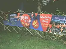 A law was implemented in 2003 prohibiting "melt or burn any wax or sprinkle or pour any liquid onto any hot wax, in such a manner as to cause or as to be likely to cause a risk of injury to any person or damage to any property" in public parks, beaches or barbecue areas. Offenders face a maximum penalty of HK$2,000 and 14 days imprisonment.[3] The Housing Department (HD) also prohibits the practice, claiming that five points deduction and a $1,500 fixed penalty notice will be imposed on offenders in its public housing estates.[4] Leaving behind wax stains in public places will also fall under "littering" and is liable to a HK$1,500 fine.[5]