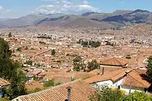 ![]() Looking southeast across Cusco and San Sebastián towards the mountain Tawqaray (center). Wayna Tawqaray is visible on its slope. Muyu Urqu is on the right. | |