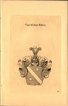 Bavarian hereditary nobility and knighthood (Ritter) on 30 April 1845 in Munich for his son Karl Weber, a royal Bavarian government secretary, 1st class in Augsburg with enrollment in the knightly class on 27 June 1845.