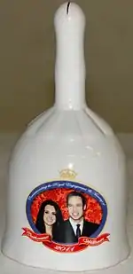 Prince William and Catherine Middleton personally approved an official range of china (including handmade plates, cups, and pill boxes) to be made for the Royal Collection and sold as souvenirs from December 2010 on.[135] The items are decorated with the intertwined initials of the couple under the prince's coronet and include the wording "To celebrate the marriage of Prince William of Wales and Catherine Middleton 29 April 2011."[136] The Lord Chamberlain's office approved a longer list of memorabilia, including official mugs, plates, biscuit tins, and porcelain pill pots. The document also clarified the use of William's coat of arms and pictures of the couple on such items. Initially, the Palace refused to sanction official tea towels, which, along with aprons, T-shirts and cushions, were deemed "in poor taste".[137] However, the restriction on tea towels, though not the other items, was later reversed. Sales of merchandising were expected to reach £44 million.[136]