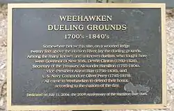 Not far from Deas' was a ledge 11 paces wide and 20 paces long, situated 20 feet (6.1 m) above the Hudson on the Palisades. This ledge, long gone, was the site of 18 documented duels and probably many unrecorded ones in the years 1798–1845. The most famous is the duel between General Alexander Hamilton, first Secretary of the Treasury, and Colonel Aaron Burr, sitting third Vice President of the United States, which took place on July 11, 1804;[28] this duel was re-enacted on its 200th anniversary (July 11, 2004) by descendants of Hamilton and Burr.[29] Three years earlier, a duel was held at this spot between Hamilton's son, Philip Hamilton, and George Eacker.[30] (Another source, however, puts the duel in Paulus Hook in Jersey City.[31]) Phillip, who had been defending his father's honor, suffered a fatal wound in his hip and his left arm and died two days later on November 24, 1801.[30]