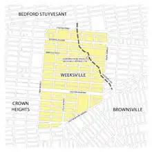 The village itself was established by a group of African-American land investors and political activists, and covered an area in the borough's eastern Bedford Hills area, bounded by present-day Fulton Street, East New York Avenue, Ralph Avenue and Troy Avenue.[7] A 1906 article in the New York Age recalling the earlier period noted that James Weeks "owned a handsome dwelling at Schenectady and Atlantic Avenues."