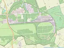 The centre is located on the site of the former RAF Wildenrath British military airfield. After the airfield closed in 1992, it was taken over by Siemens who opened the test and validation centre in June 1997.[1][2] It had five tracks over 35 hectares (86 acres).[3] By 2007, the railway test tracks had taken over considerable areas of the airfield, with all but the western threshold and overrun of the runway obliterated. The north-east dispersal is completely taken over by sidings, workshops and loops. Of the southern dispersals, the central and eastern are bisected by the main railway oval test track.