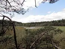 The Weißes Fenn Marzahne was formed after the last cold period, the Weichselian Glaciation. Advancing ice masses pushed a series of tunnel valley basins similar to the parallel Beetzsee-Riewendsee- or Bohnenland-Görden glacial valley, in which meltwaters flowed or collected. These ran from northeast to southwest in the direction of the advancing ice. In this series of tunnel valleys, lakes were subsequently formed, like the Pritzerber See in the southwest. Later low lines of dunes crossed the valley bottoms and they still do today in the northeast of the row of tunnel valleys.[1] These lines of dunes formed a barrier for the Weißes Fenn ("White Fen") to the southwest, so that water could no longer drain in that direction and a boggy wetland was created. In the modern period, a ditch, the Roter Graben, was cut to drain the wetland and the lake. This empties into the Pritzerber See.[2] The Weißes Fenn Marzahne with the Marzahner Fenn, an ice age glacial tongue basin which lies about 2 kilometres to the southeast.